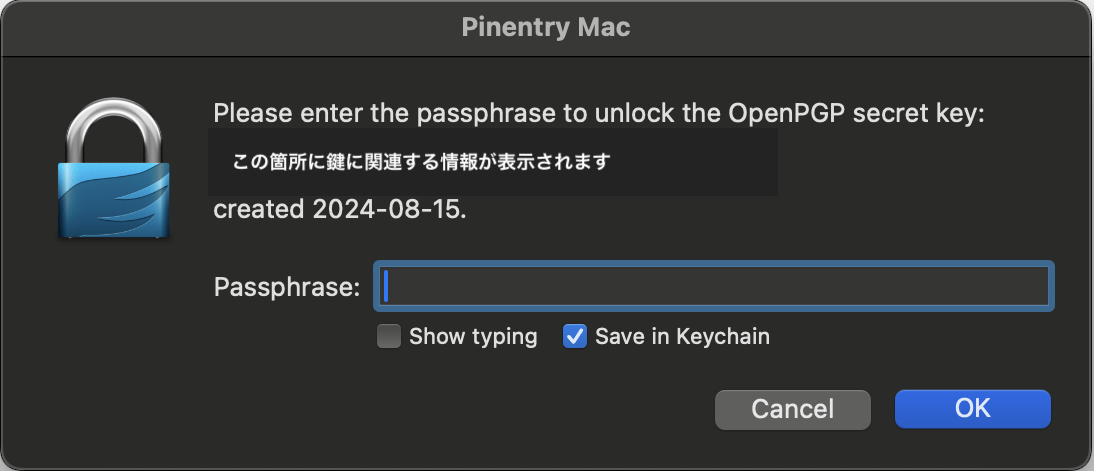 pinentryのダイアログが表示されますので、こちらにPGPのパスフレーズを入力します。